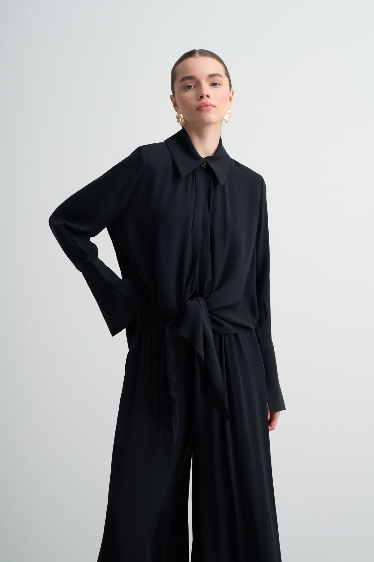 يقدم القميص بدائل استخدام مختلفة بفضل تفاصيل الربطة الاختيارية.