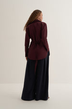 Geniş yakaları, vatka detaylı omuz tasarımı ve arka kemeri ile güçlü bir silüet sunar