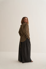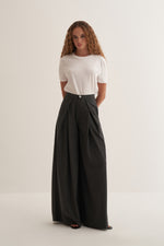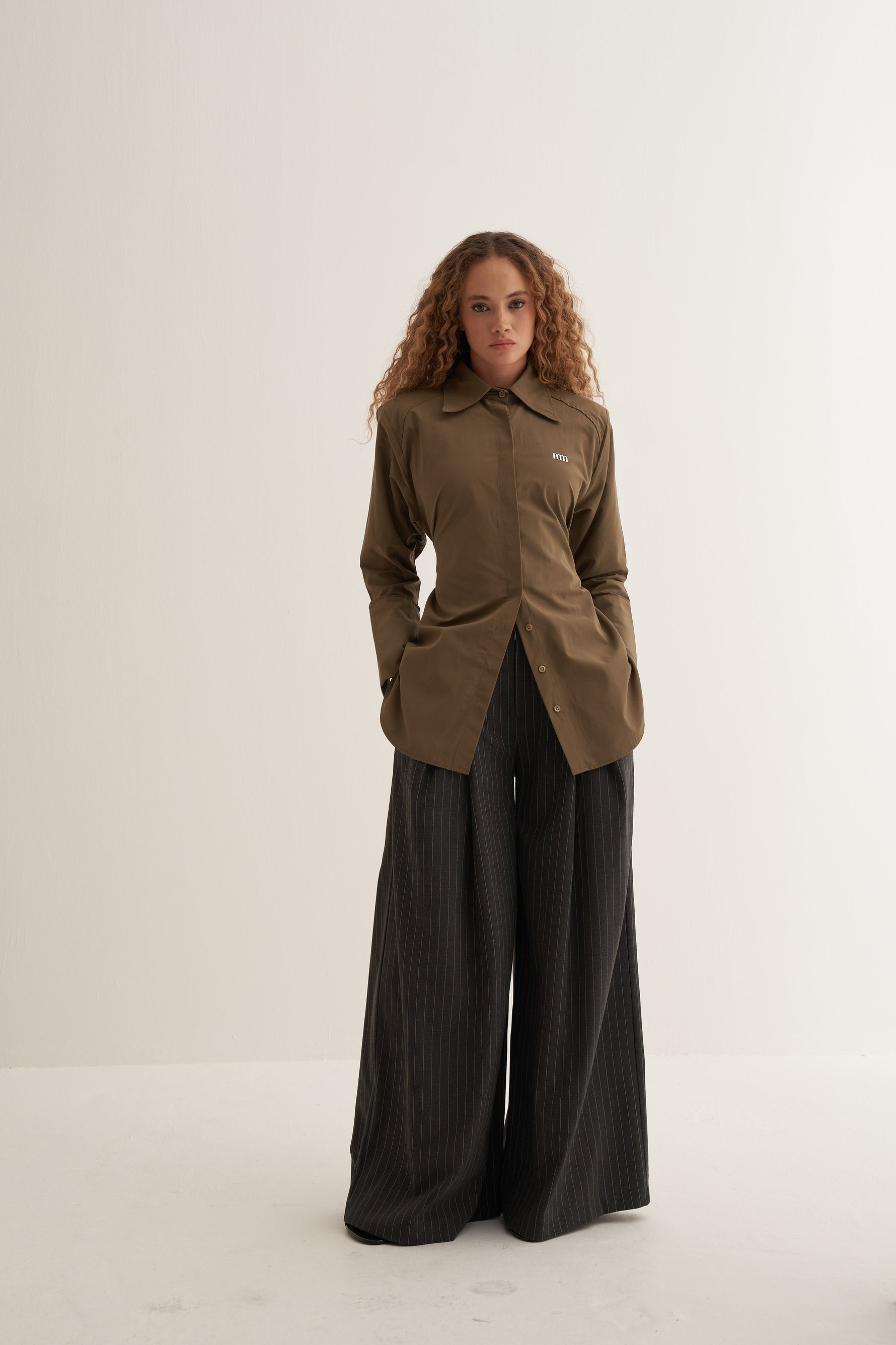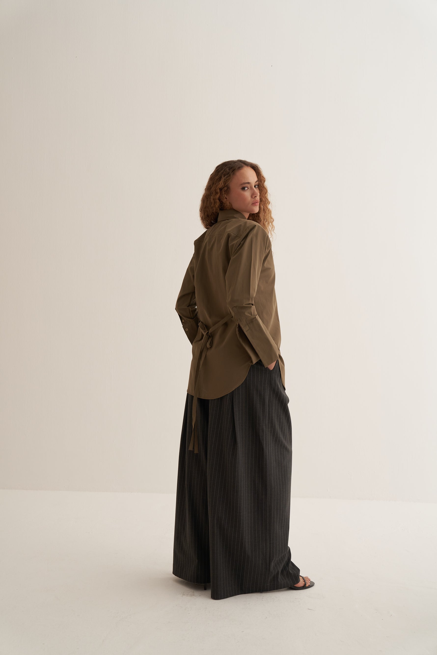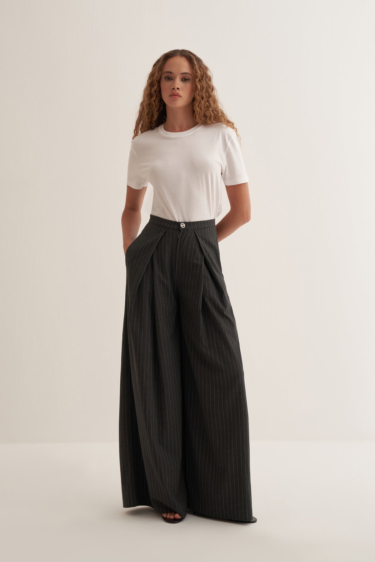 Çizgili deseni ve geniş paça tasarımı ile modern, zamansız ve rahat bir stil sunar