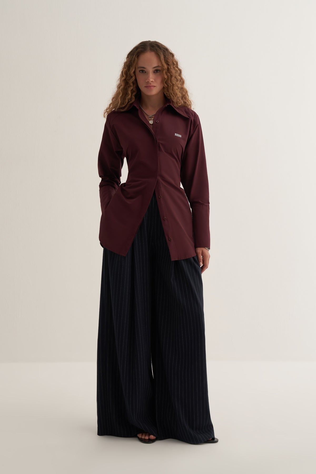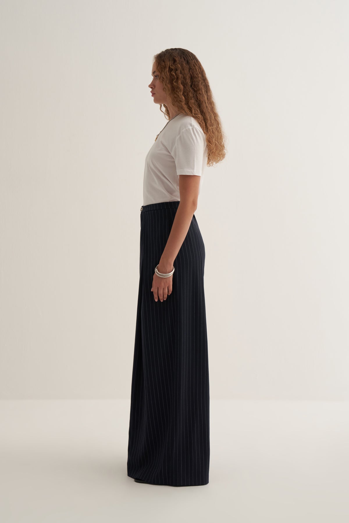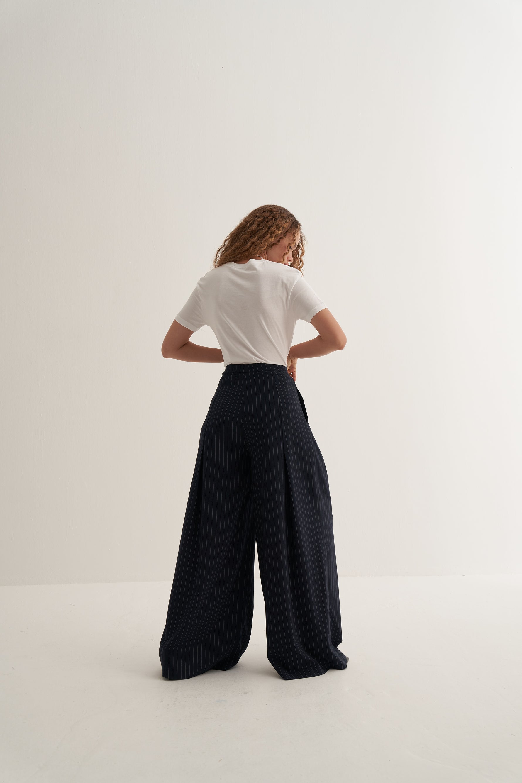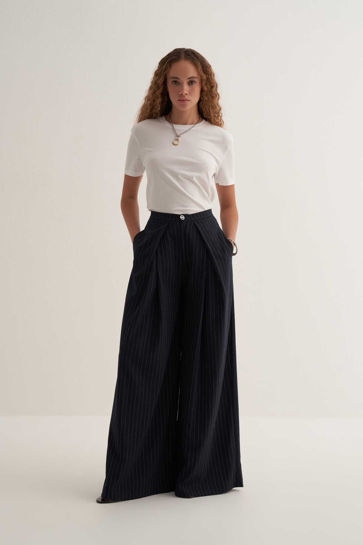Çizgili deseni ve geniş paça tasarımı ile modern, zamansız ve rahat bir stil sunar