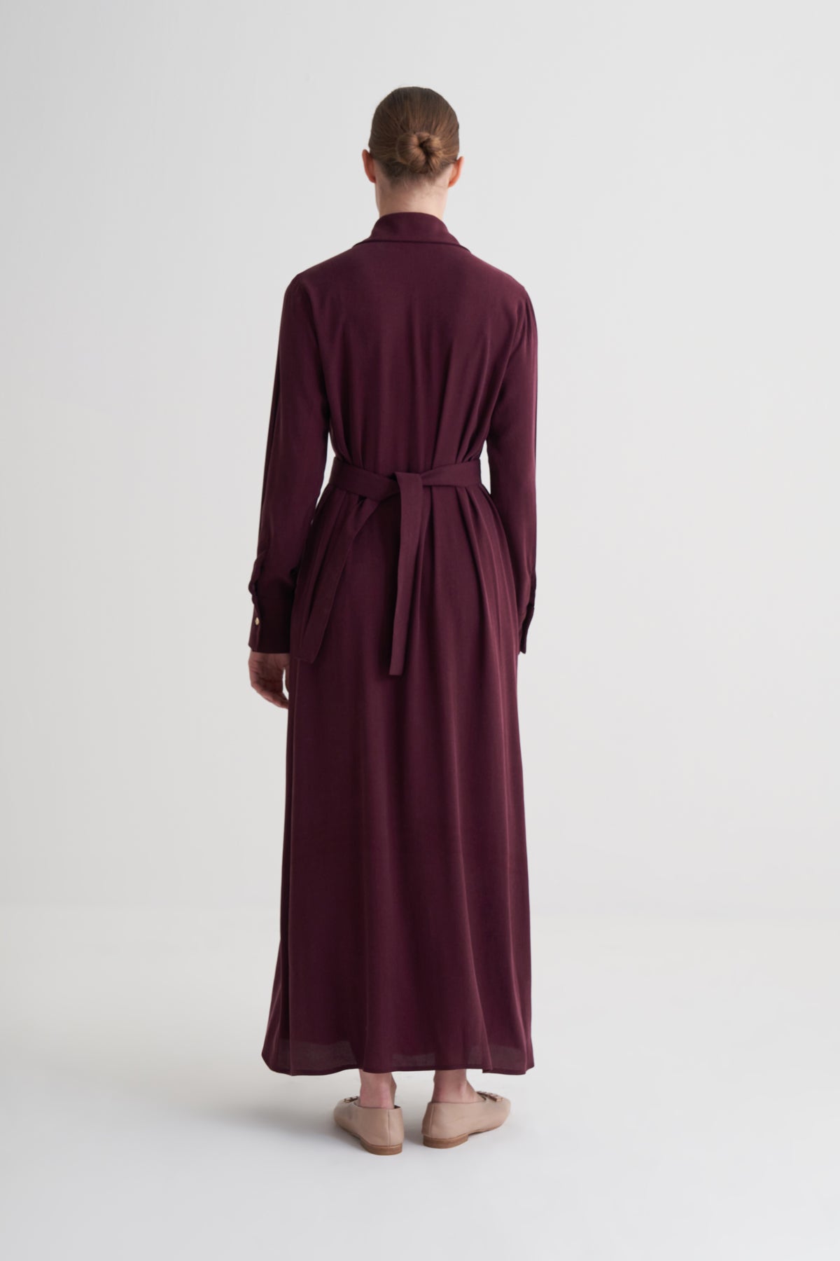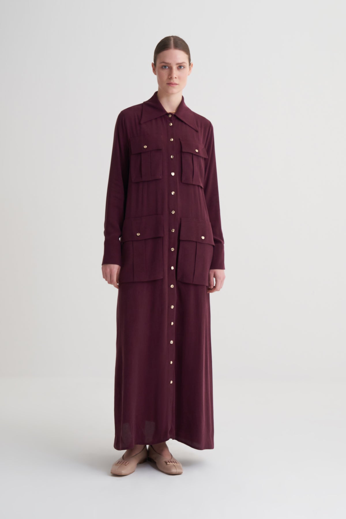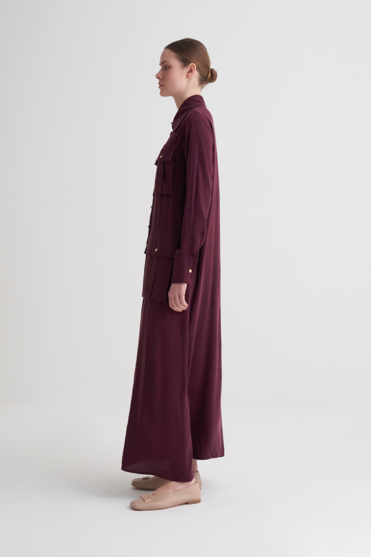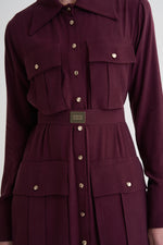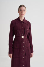 Bordo Cupro Viscose Düğmeli Elbise