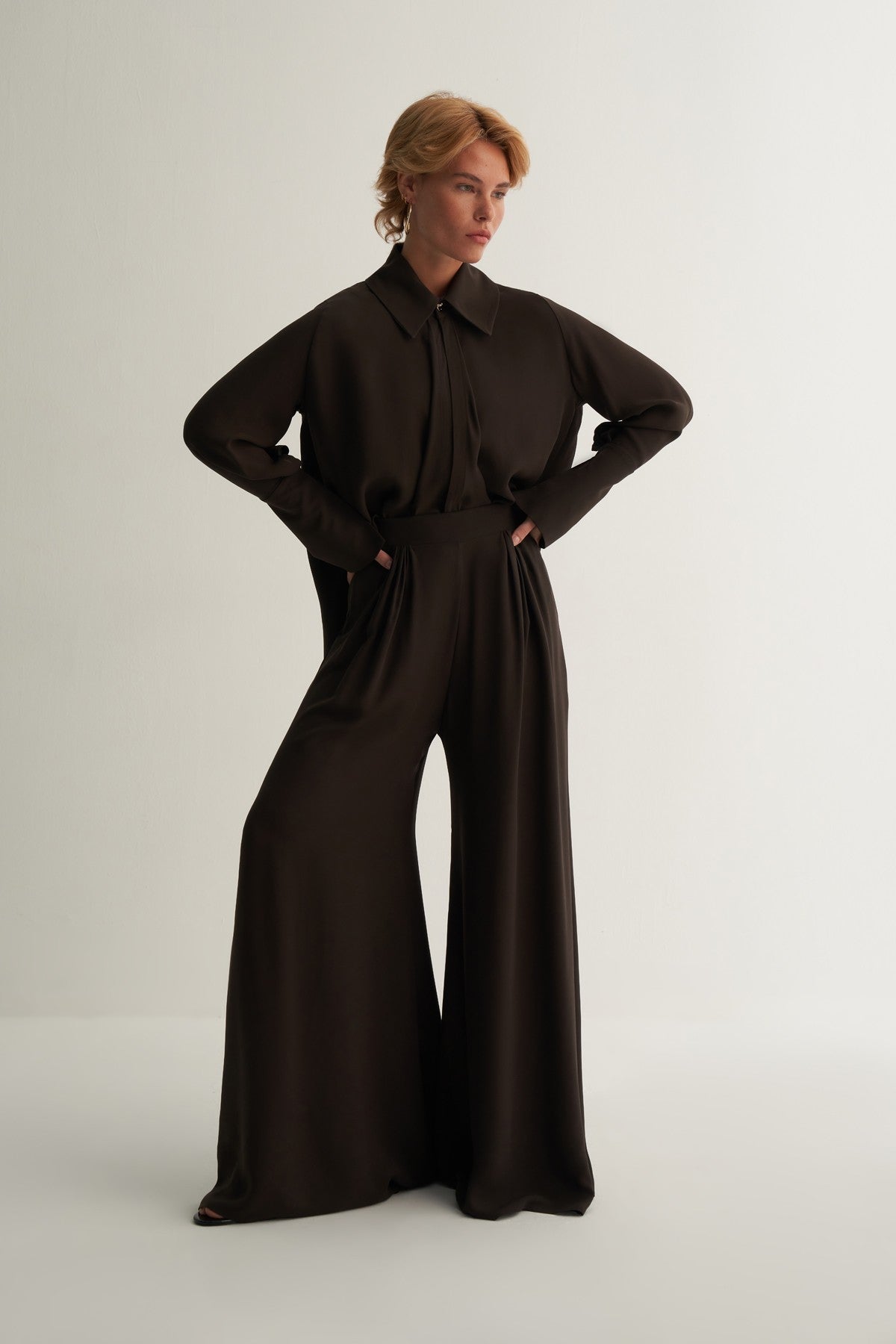 Arka kısmı lastikli, yandan fermuarlı ve önden büzgü detaylı pantolon.