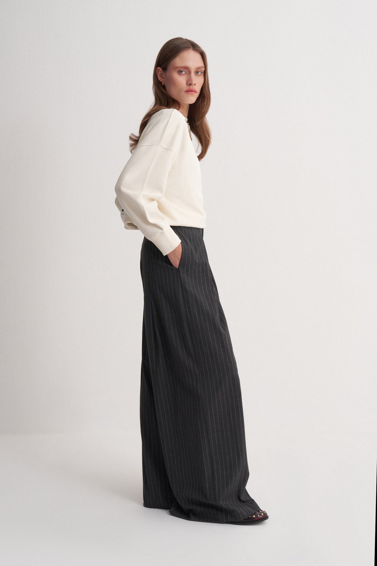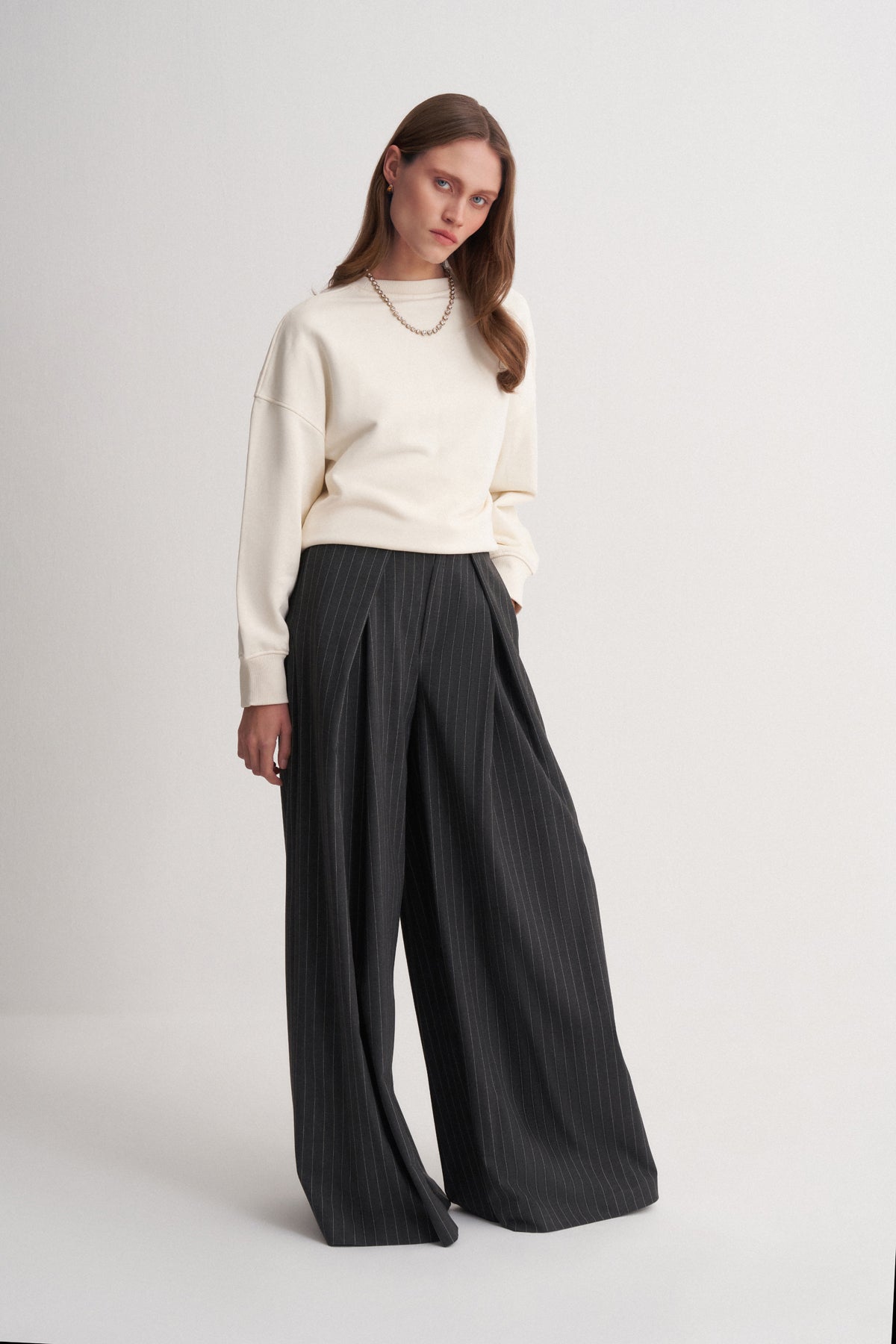 Çizgili deseni ve geniş paça tasarımı ile modern, zamansız ve rahat bir stil sunar