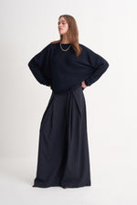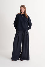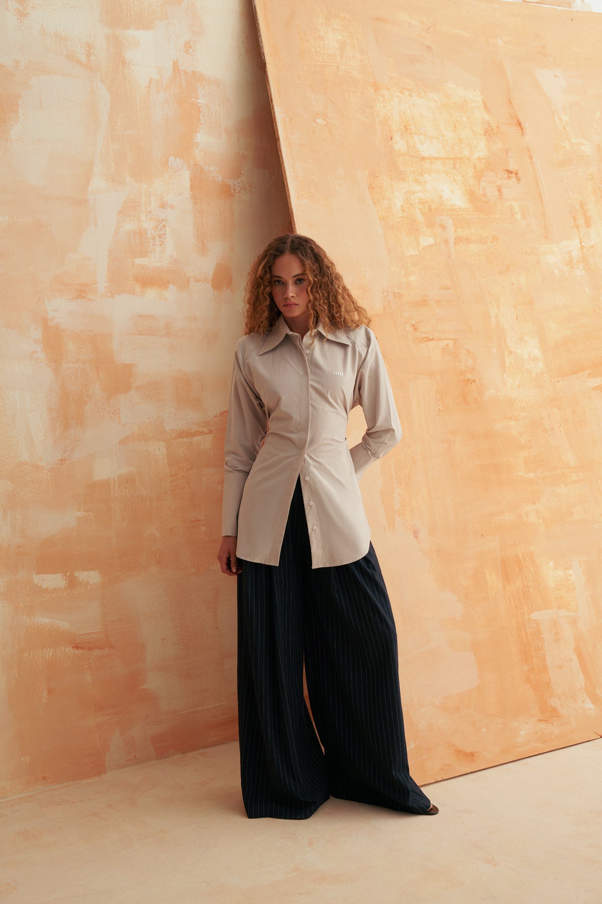 Çizgili deseni ve geniş paça tasarımı ile modern, zamansız ve rahat bir stil sunar